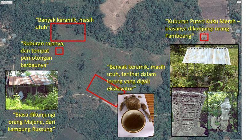 “On the summit of the hill were a number of ceramic sherds ranging from early Chinese monochromes to Ming celadons and Ming blue-and-whites. This is evidence that Passakorang was part of the trade networks that from the thirteenth century onwards connected South Sulawesi to the wider archipelago. On the opposite side of the river is a commemorative site known as Allamungung Batu where the “seven upriver and seven downriver” federation of Mandar is said to have been established.”