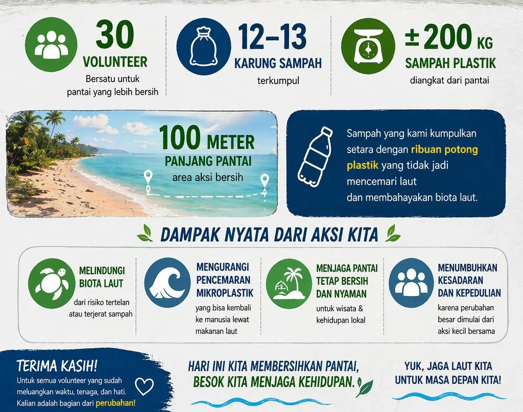 Tiga puluh orang yang hadir menunjukkan kapasitas intervensi komunitas. Seratus meter garis pantai menjadi unit kecil dari persoalan yang lebih luas. Dan dua ratus kilogram sampah adalah indikator nyata dari tekanan manusia terhadap ekosistem pesisir.